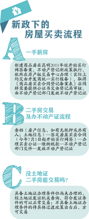 从6月30日开始,昆明在全市范围内实施不动产统一登记,目前时间已经过去半月。对于大部分昆明人而言,实施不动产登记影响最大的,就是房屋交易,特别是二手房屋交易。在实施不动产登记后,一些买了房却没有拿到土地证的昆明业主有些着急:没有土地证的房子还能卖出去吗?房产证、土地证双证合一的不动产登记,如果没有土地证会产生什么影响?购买新房是否需要进行不动产登记?昆明市国土资源局表示,目前正在研究过渡性举措,以解决眼下推进不动产登记中出现的普遍性问题。
