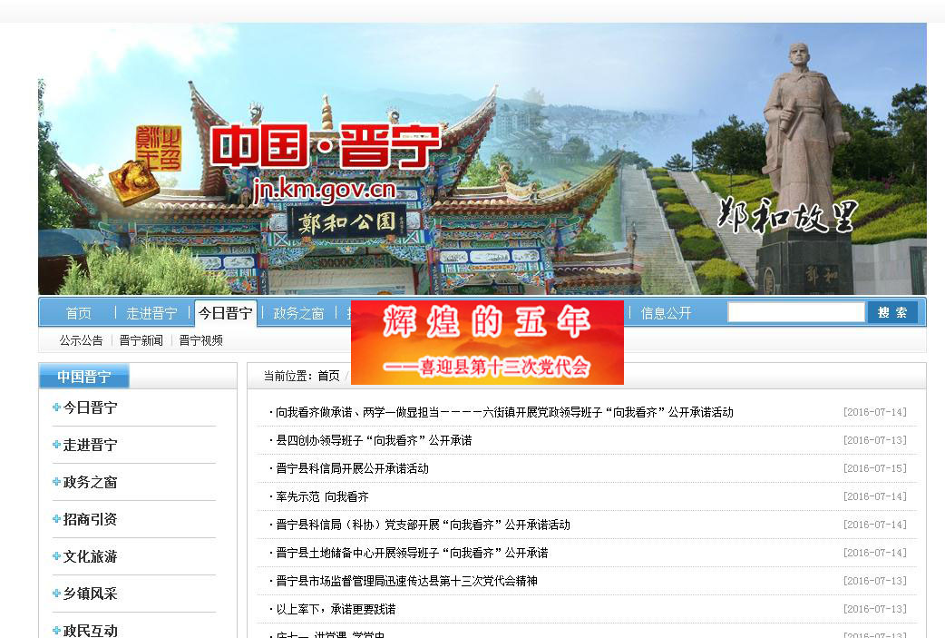 县科信局结合自身实际,充分利用网络平台,以《辉煌的五年》为宣传专题,在晋宁县政府门户(即中国•晋宁http://www.kmjn.gov.cn/ )网站设置党代会宣传专栏,通过网络平台把我县第十三次党代会精神及时向公众进行了传递,为晋宁经济社会的发展凝心聚力,从而调动全县人民群众以更严更实的优良作风攻坚克难,一步一个脚印把党代会勾画的美好蓝图变为现实。(金翠苹)