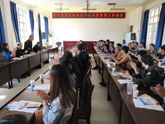 为进一步净化文化市场,规范市场经营行为,切实将将创建全国文明城市、扫黑除恶工作措施、工作要求落到实处。2018年10月17日下午14点30分,昆明市晋宁区文化市场综合执法大队在晋宁区图书馆三楼会议室组织文化市场经营户召开了“晋宁区文化市场创文”及“深入开展扫黑除恶专项斗争主题宣传教育活动”培训会议。
