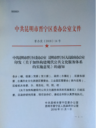 11月1日,由晋宁区文体广电旅游局起草,中共昆明市晋宁区委办公室、昆明市晋宁区人民政府办公室下发《关于加快构建现代公共文化服务体系的实施意见》(晋办发〔2018〕16号)向社会公布。为晋宁区加快构建覆盖城乡、便捷高效、保基本、促公平、彰显地方特色的现代公共文化服务体系,不断提升城乡人民群众美好生活水平,把晋宁建设成为面向南亚、东南亚的国际康养旅游新区、古滇郑和文化名城、高原湖滨宜居新城提供强大的文化支撑和精神动力。