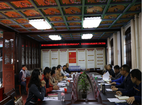 工作汇报会上,晋宁区人民政府普娅馨副区长就晋宁文化系统扫黑除恶专项斗争、安全生产及文化市场综合执法改革工作成效进行了汇报。晋宁区文体广电旅游局、晋宁区安监局、晋宁公安分局、晋宁区市场监管局、古滇管委会相关人员参加汇报。