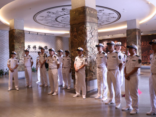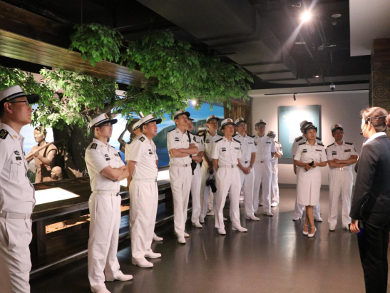 在讲解员的带领下,大家依次参观了各个展厅,来到郑和文化展厅时,大家倍感亲切,郑和是一位开创伟大时代的传奇英雄,他率领舰队坚定地驶向海洋,是世界大航海的先驱,人类认识、征服世界进程中的重要里程碑。参观过程中,大家看到馆内陈列着熟悉的“郑和舰”模型,客串起了讲解员,提到郑和舰作为我国首艘训练舰,立于训练舰之首,也立于海军初级指挥人才建设的最前沿,它无愧于中国“军校第一舰”的美名,也当得起海军授予的“功勋训练舰”荣誉称号。