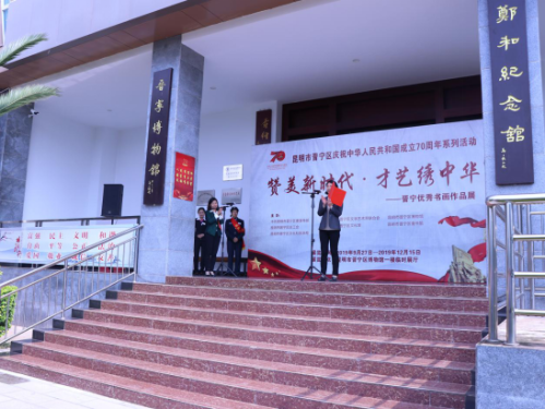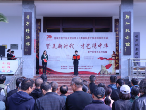 开展仪式由区文化和旅游局局长陶永芳局长主持,昆明市晋宁区人大常委会副主任、区总工会主席赵丽娟同志致辞,中共昆明市晋宁区委副书记、副区长周丽同志宣布《庆祝新中国成立70周年“赞美新时代•才艺绣中华”晋宁优秀书画作品展》开展。在开展仪式上中共昆明市晋宁区委宣传部副部长、区文联主席段丽娟同志,昆明市晋宁区总工会常务副主席张宏文同志为李博、魏国新等6位代表优秀作品参展作者颁发了《晋宁博物馆收藏证书》。