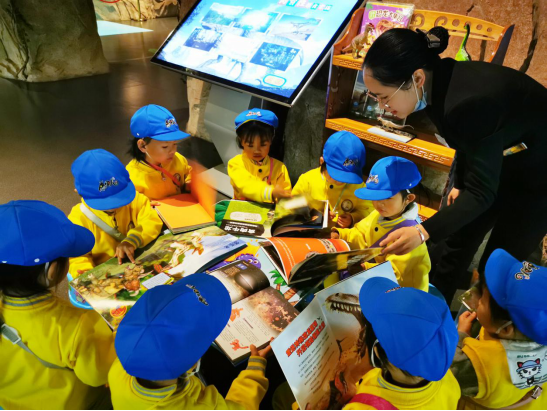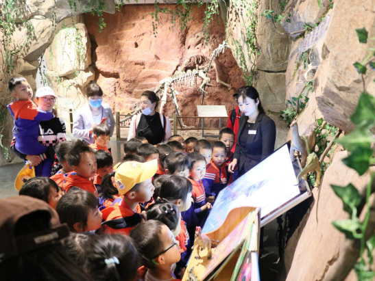 ▲讲解员在恐龙科普教育互动区观看