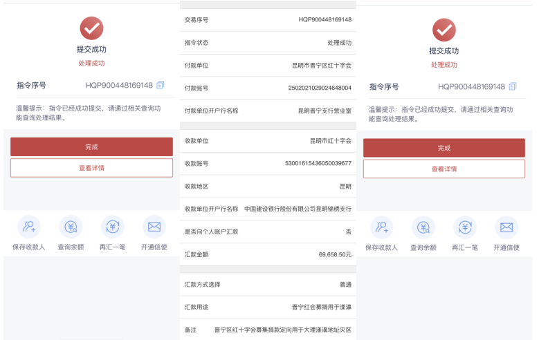 所有捐款已于2021年7月12日上缴昆明市红十字会统一汇缴云南省红十字会。昆明红十字救援队队员捐款于2021年汇同昆明红十字救援队捐款购买物资,于2021年6月16日运送到大理捐赠给漾濞县红十字会救助受灾群众。监督电话:0871-67893542