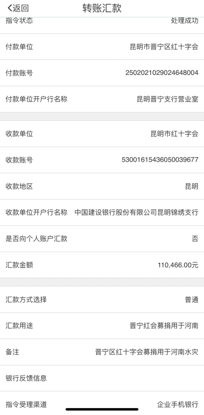 8月25日,“河南抗洪救灾”捐款110466元,全部上缴昆明市红十字会汇缴云南省红十字会用于河南抗洪救灾。