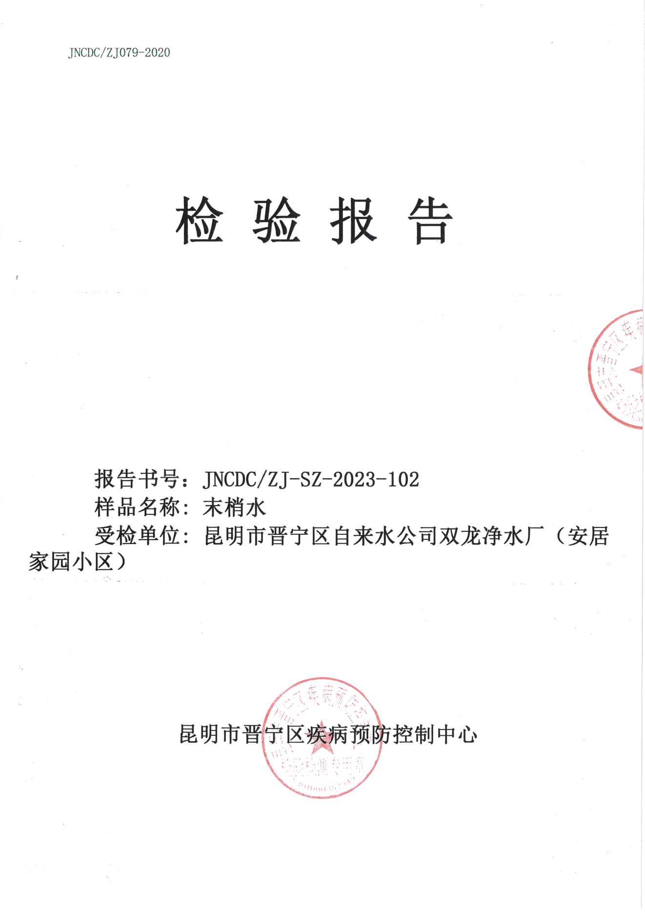 昆明市晋宁区双龙净水厂(安居家园小区)末梢水水质公示(2023年8月)