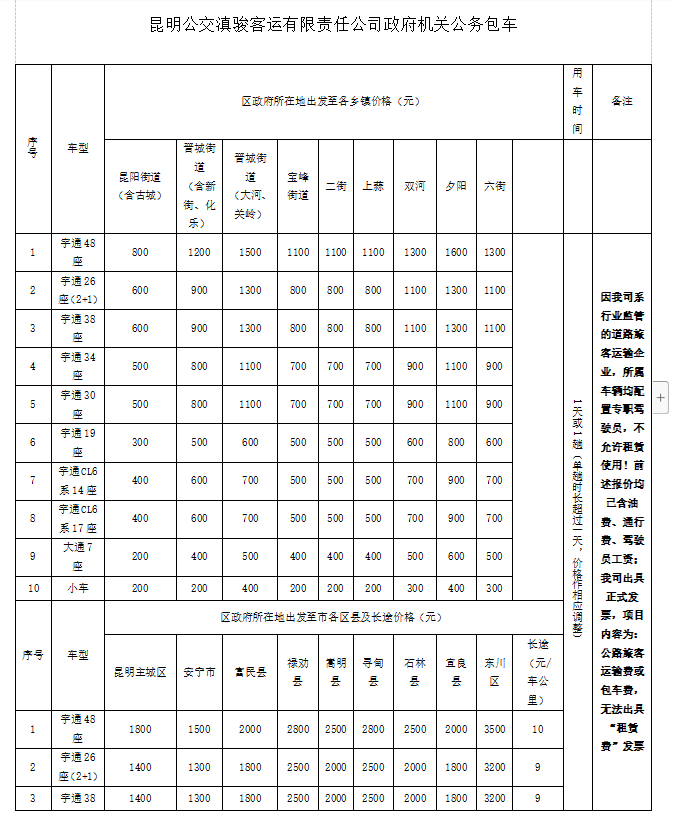 昆明公交滇骏客运有限责任公司 | 普通燃油车 | 五座轿车(1.5L及以下) | 大众桑塔纳 | 200 | 300 | 1.5 | 4500 | 该价格为最高限价,具体价格由用车单位与服务商根据车型实际情况以不超过最高限价进行协商。 |