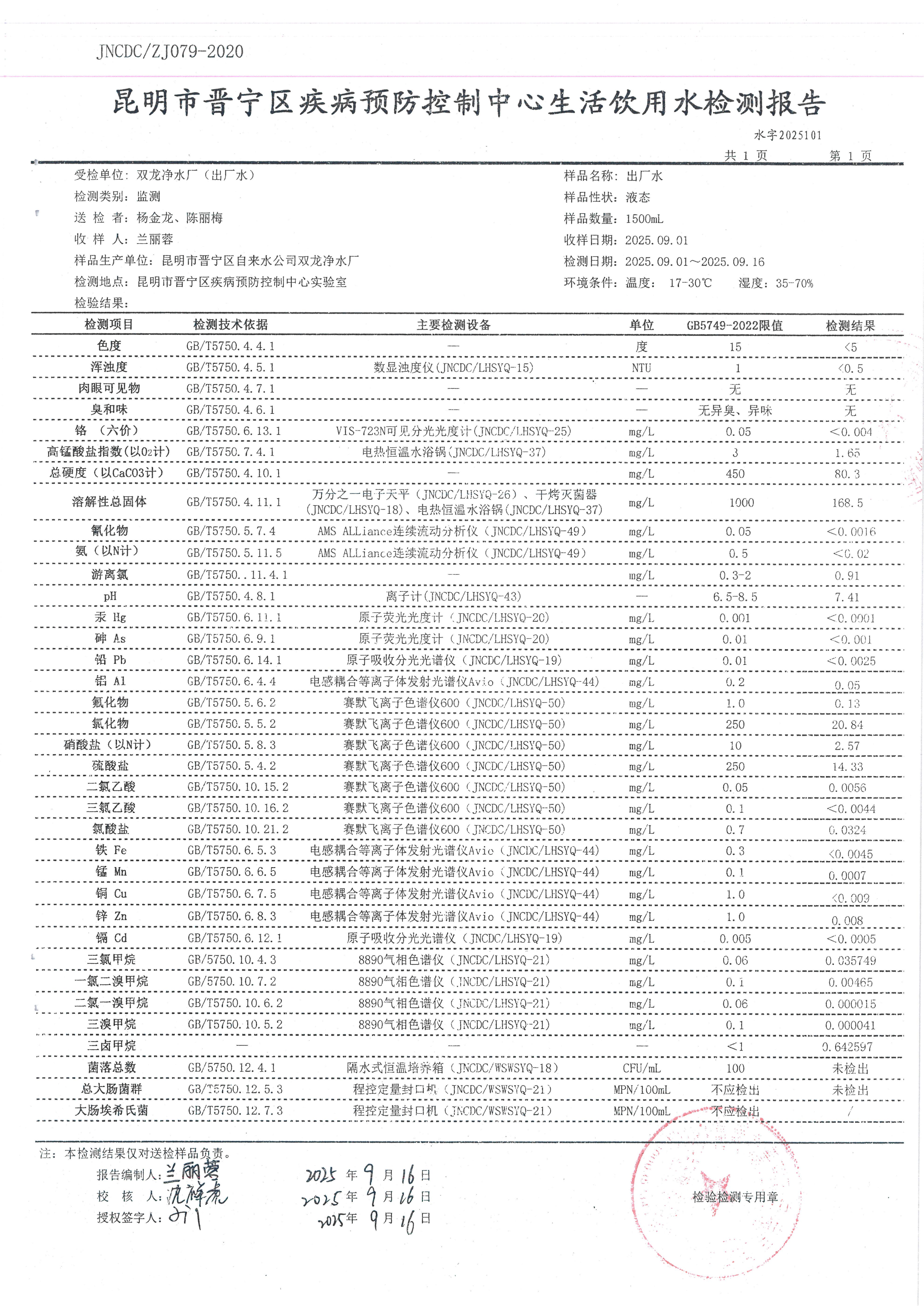 昆明市晋宁区双龙净水厂出厂水水质公示(2025年9月)
