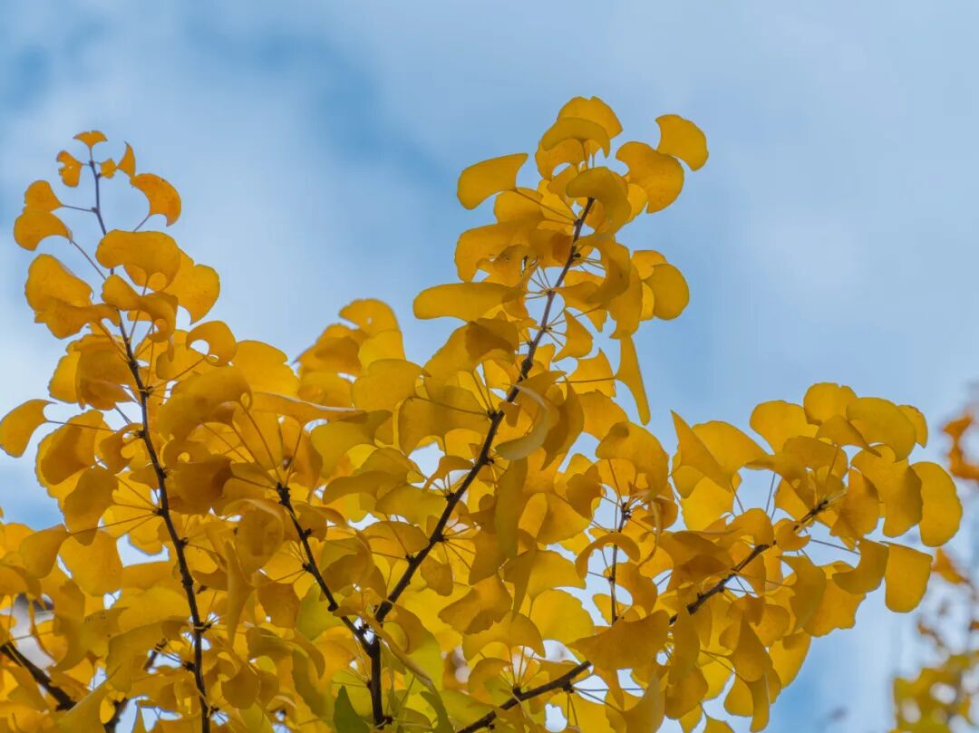 更让人心动的,是那一树树红枫和一串串银杏。枫叶红得炽烈,在蓝天下像一团团燃烧的火焰,燃烧得悄无声息,它们层层叠叠汇成了漫天的红霞,安安静静地装点着这个季节。而银杏,则大大方方地黄着,黄得如金,灿得似火,阳光一照,闪烁着金光。一阵微风吹过,那黄透了的叶子,如同金色的蝴蝶,不紧不慢地从枝头飘落,旋转、翻飞……最终静静地卧在了地上,铺成一条柔软的金色地毯。踩上去,发出窸窸窣窣的声音,仿佛是与深秋最温柔的对话。
