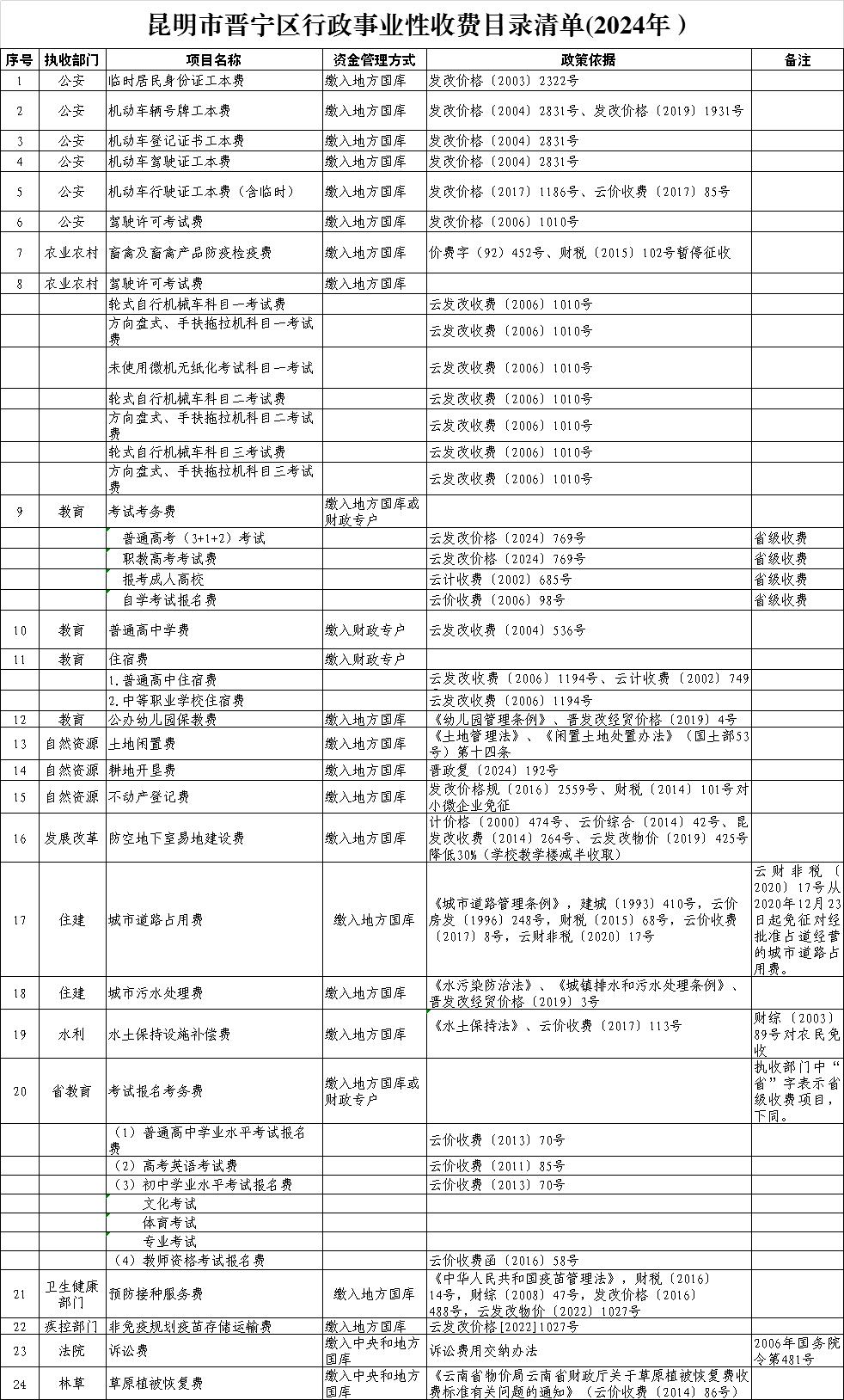 昆明市晋宁区行政事业性收费目录清单(2024年)