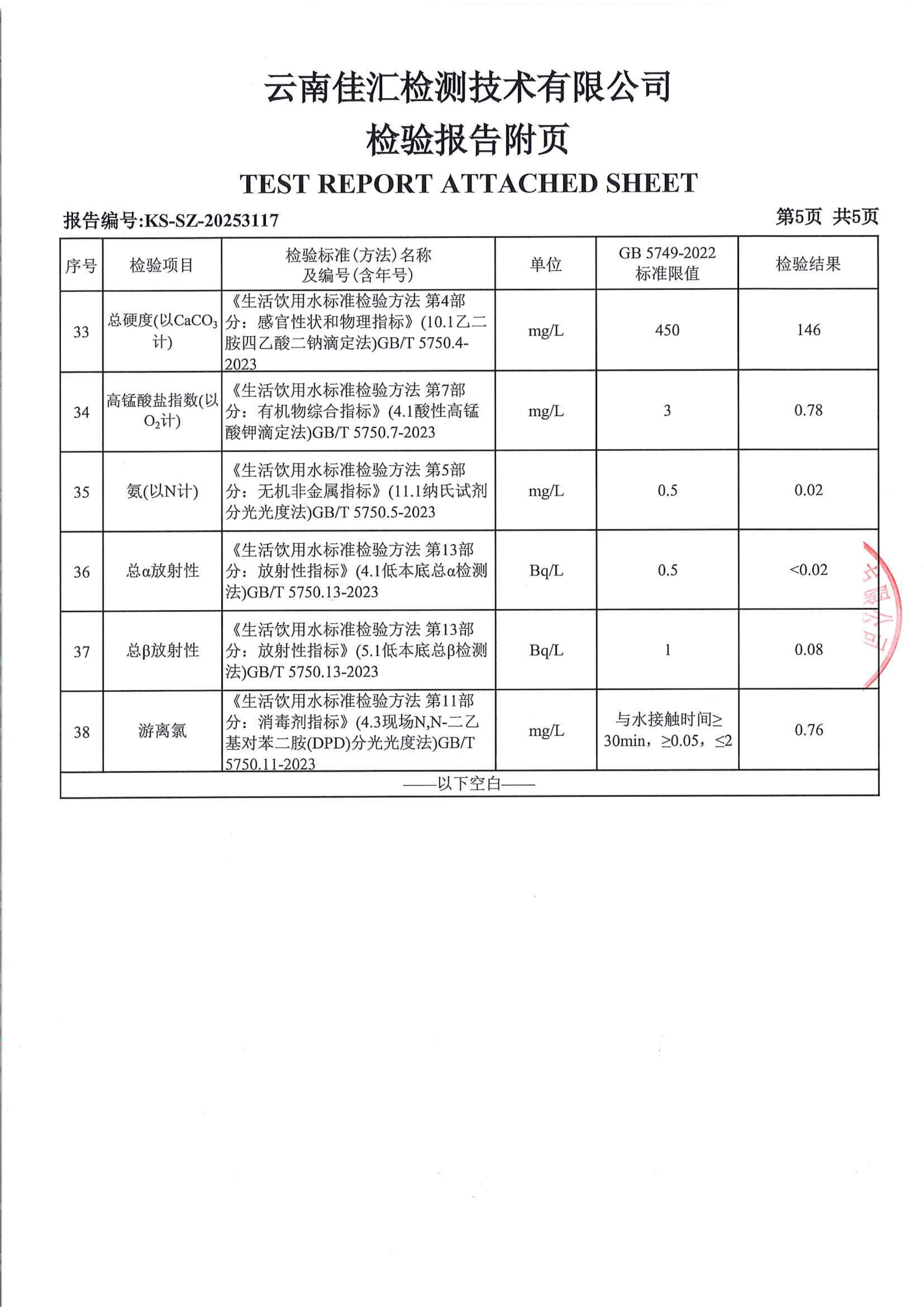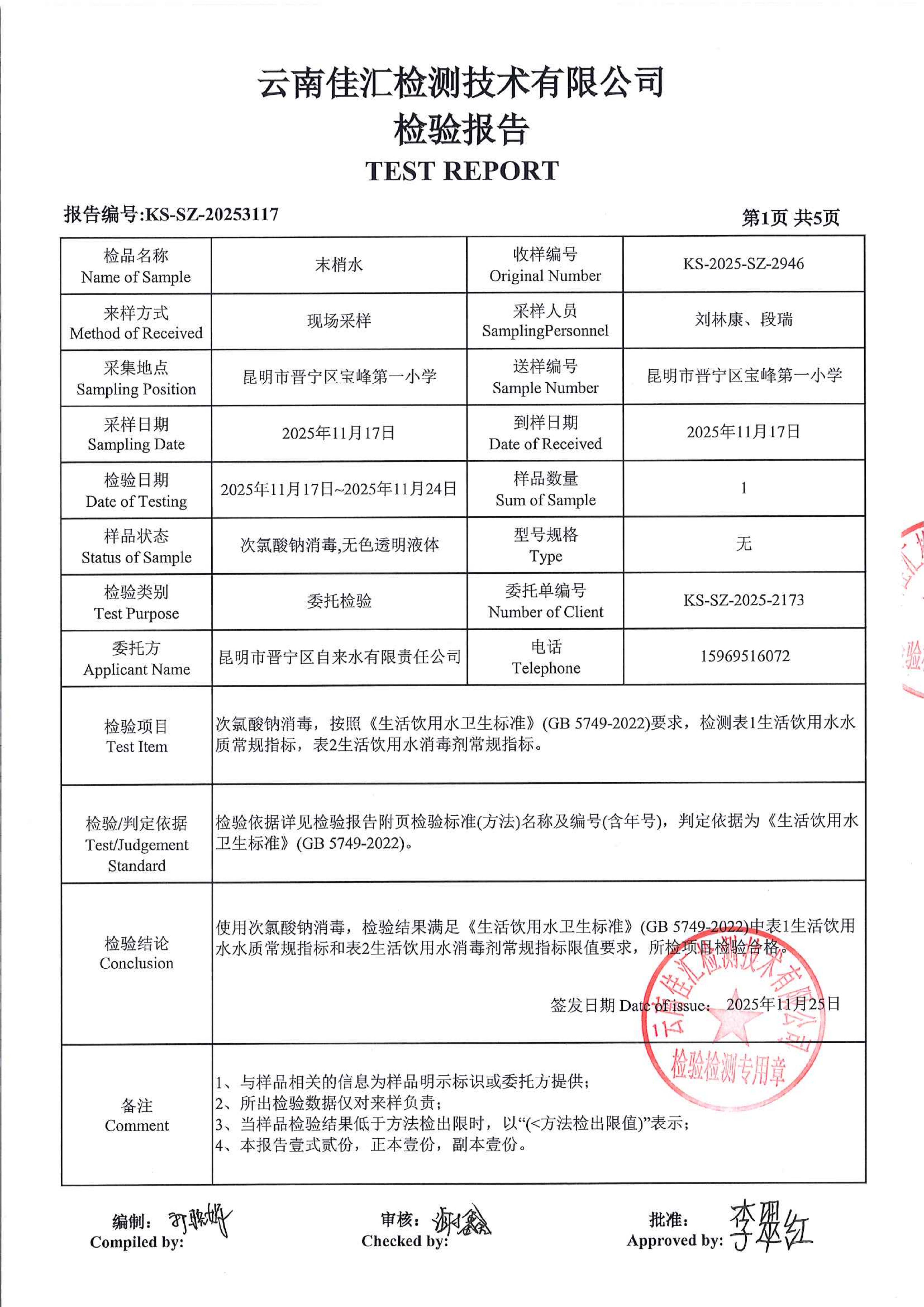 昆明市晋宁区宝峰第一小学水质公示(2025年11月)