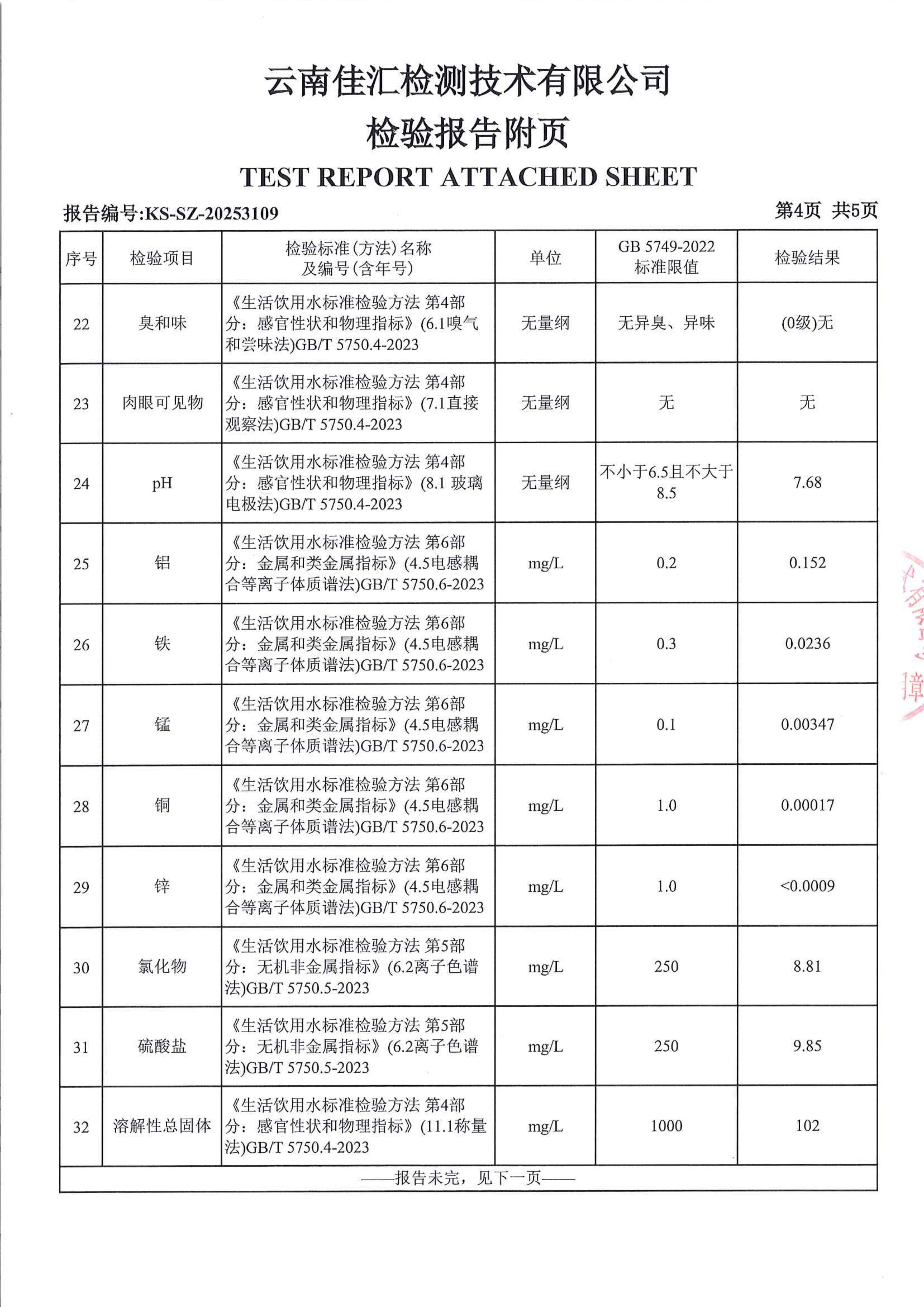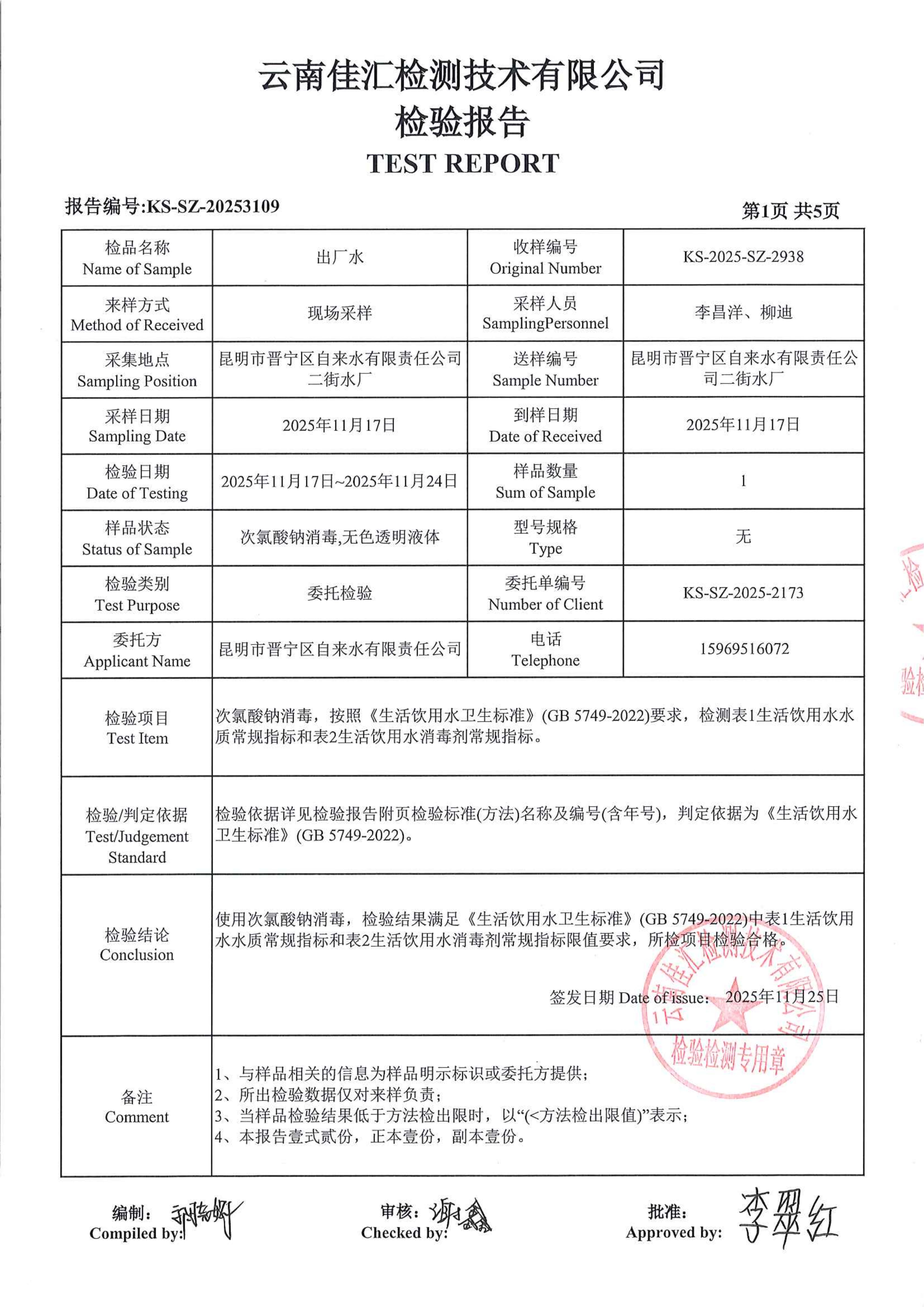 昆明市晋宁区自来水有限责任公司二街水厂水质公示(2025年11月)