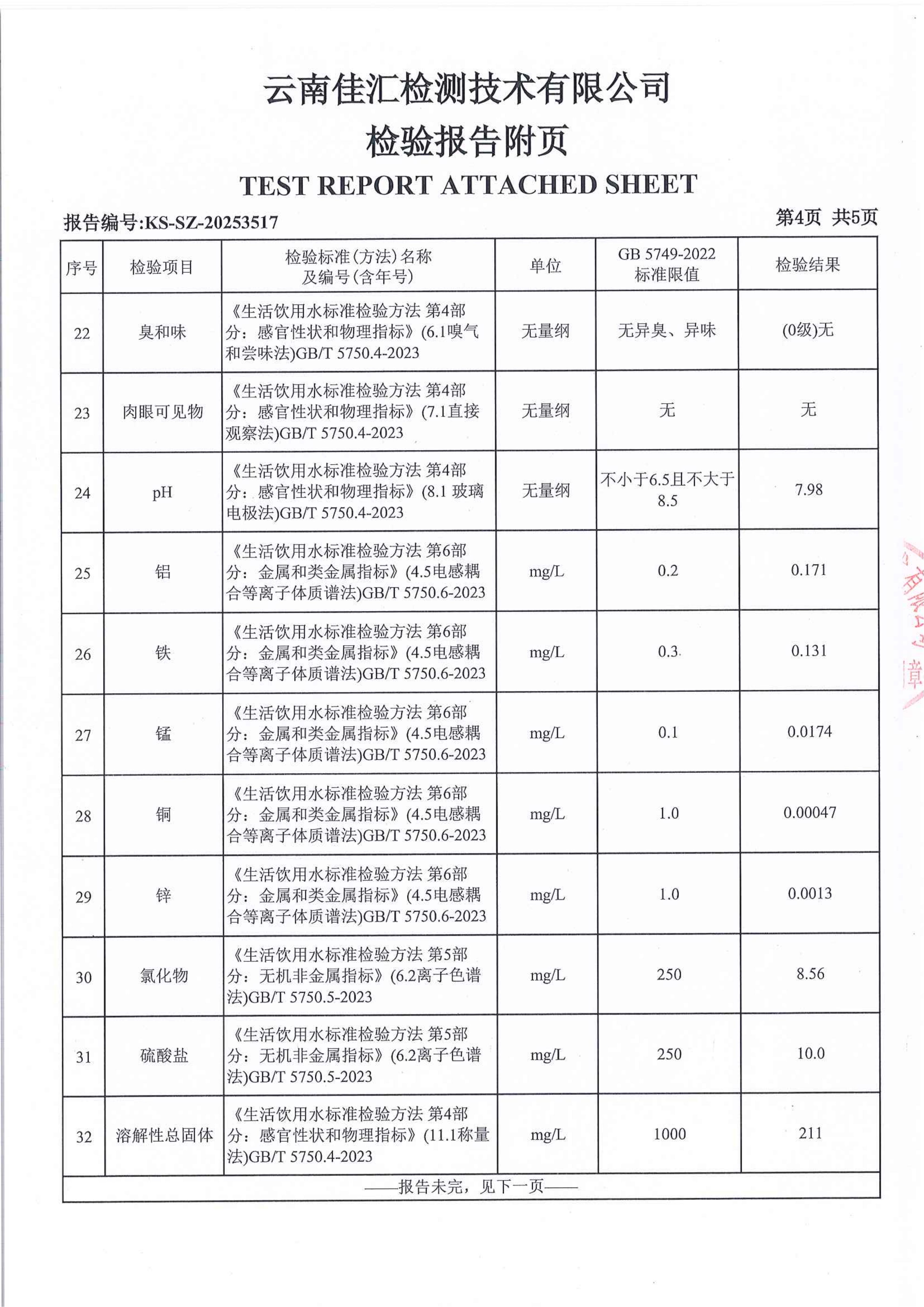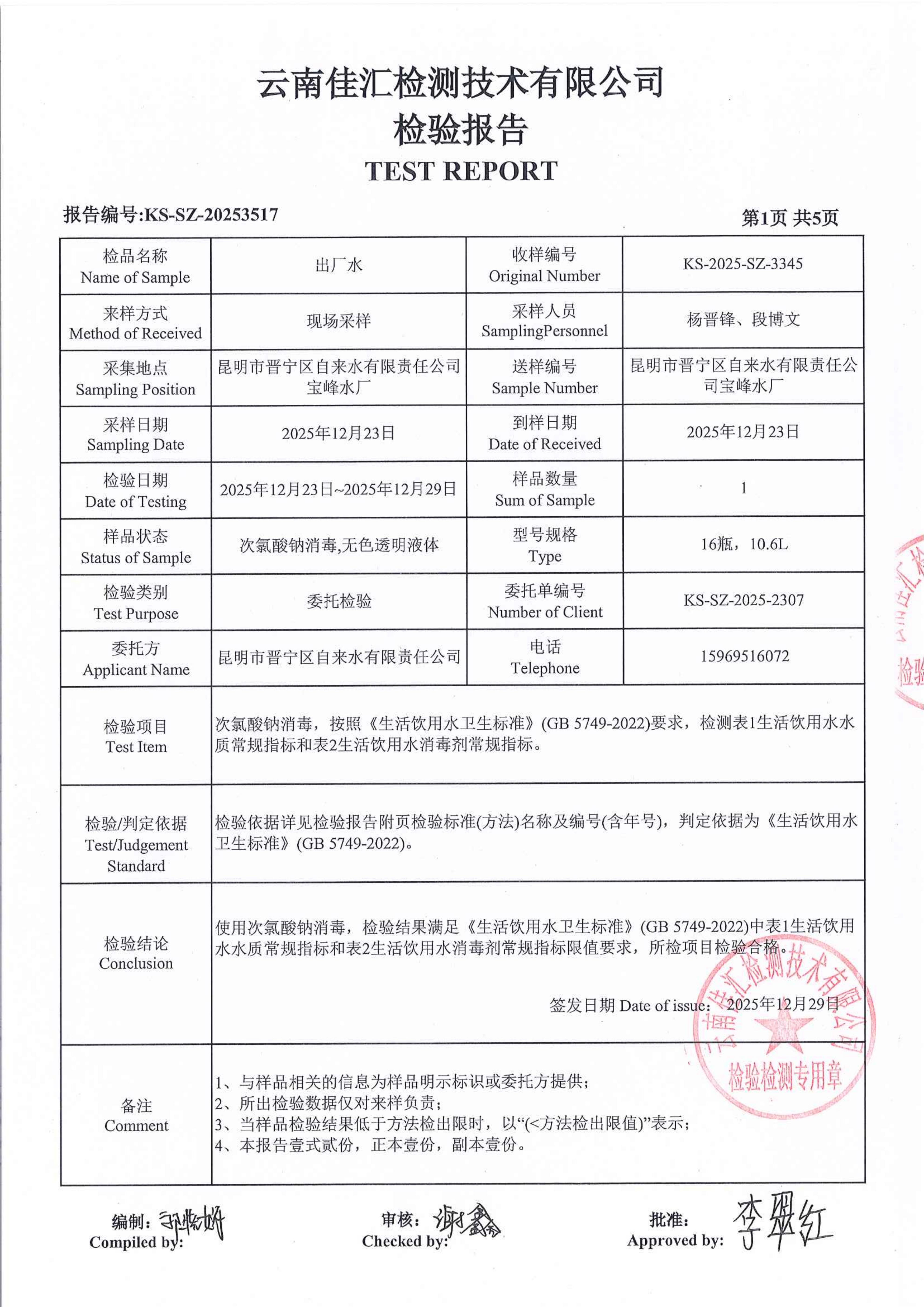 昆明市晋宁区宝峰水厂出厂水水质公示(2025年12月)