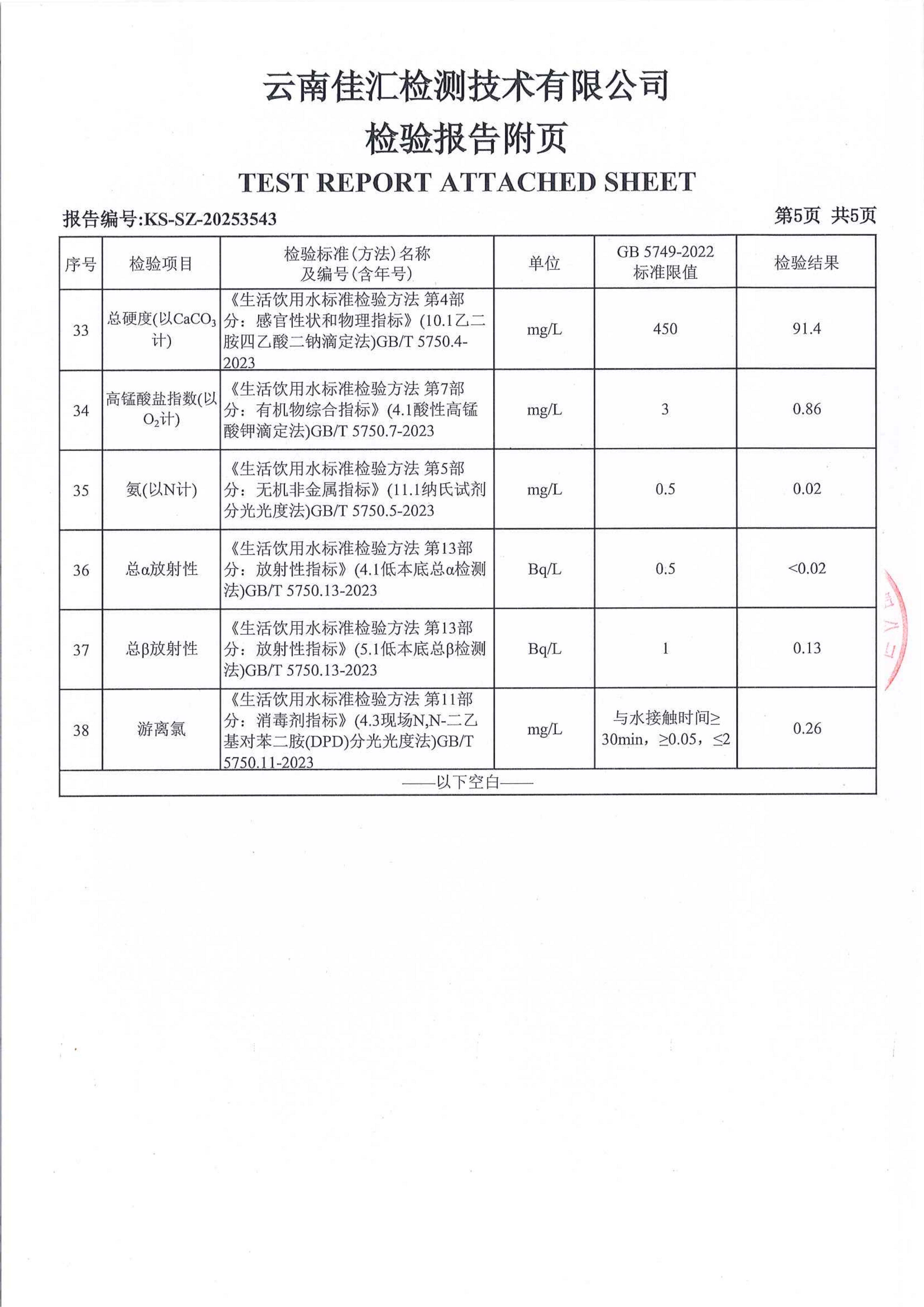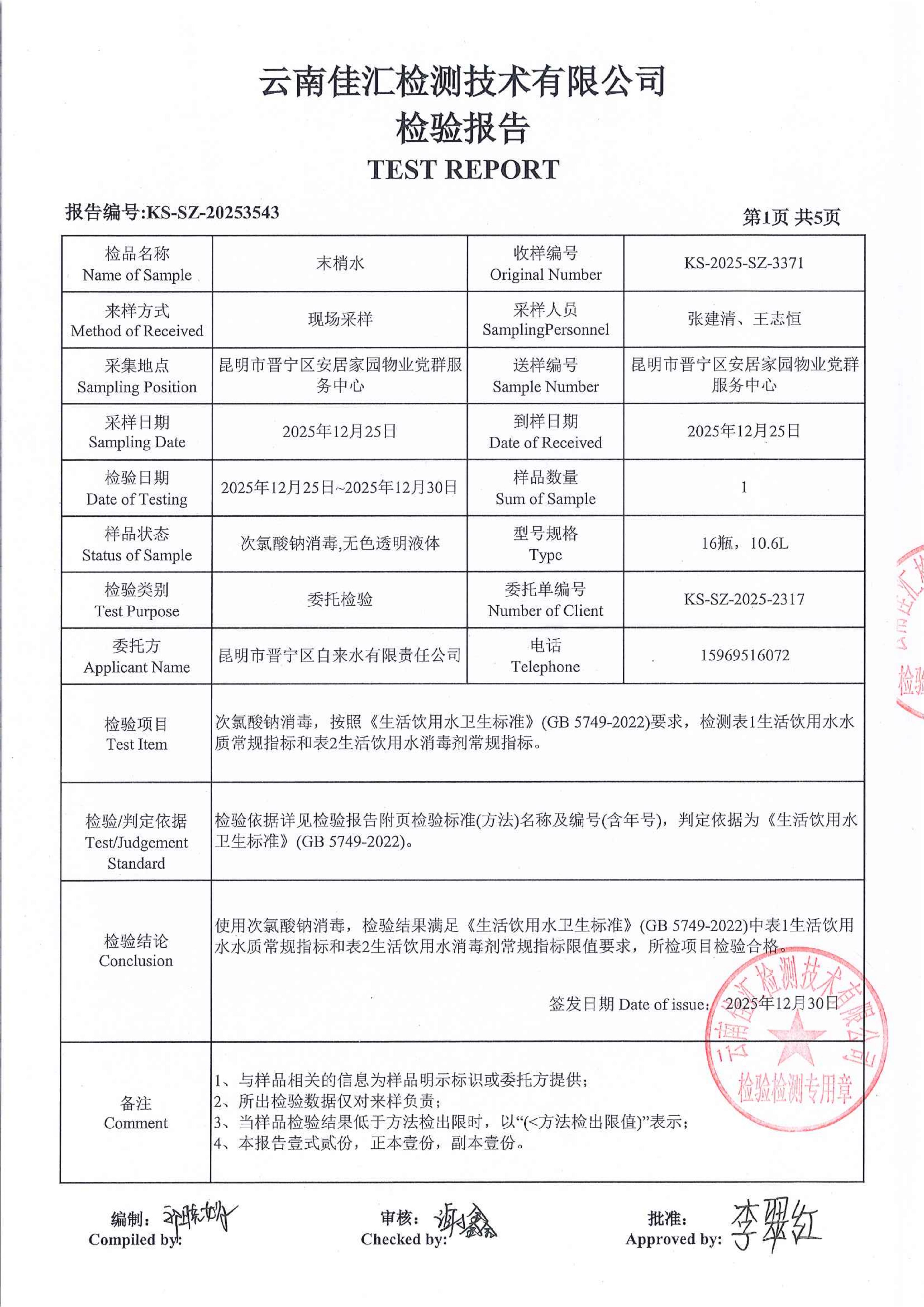 昆明市晋宁区安居家园物业党群服务中心水质公示(2025年12月)