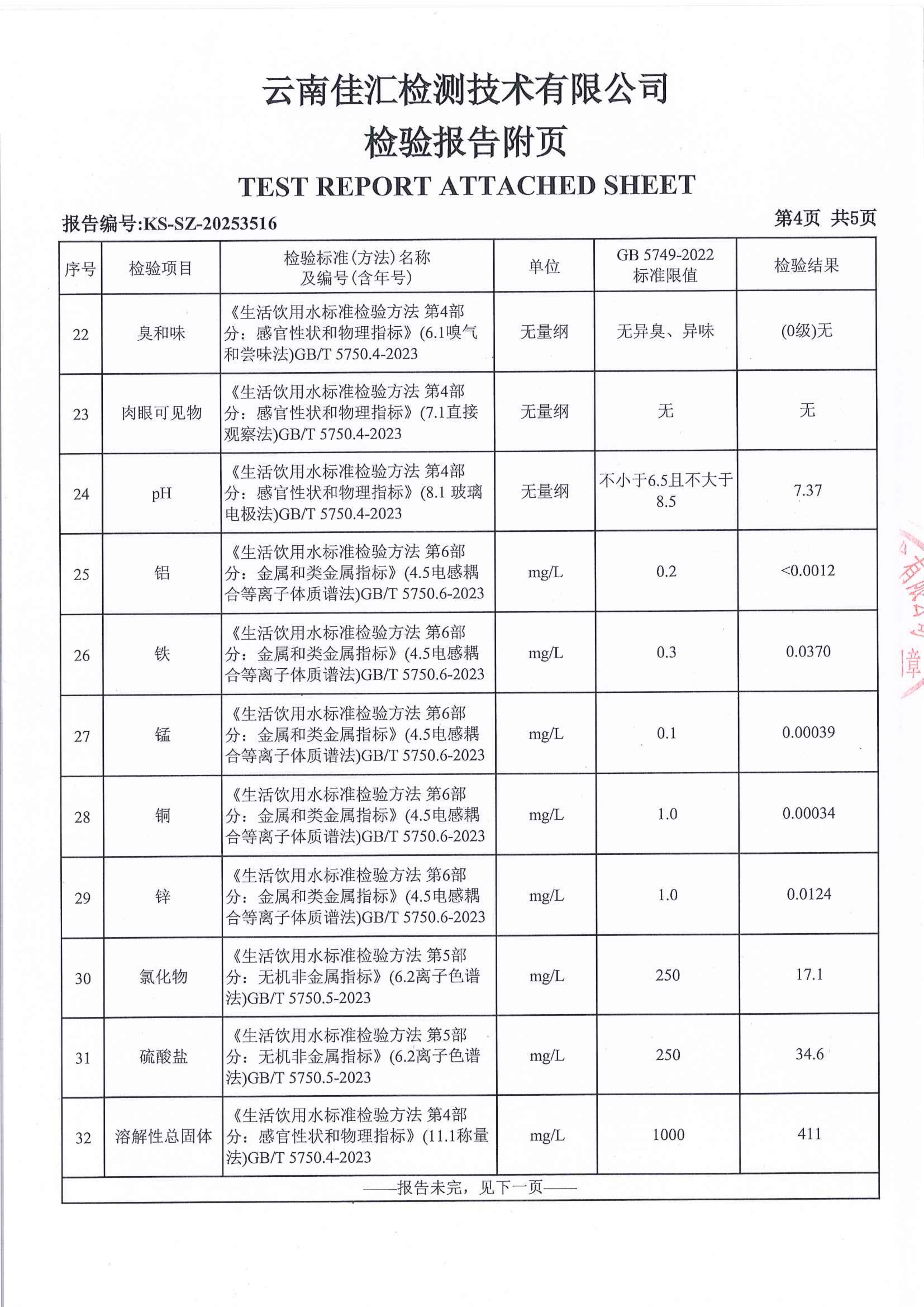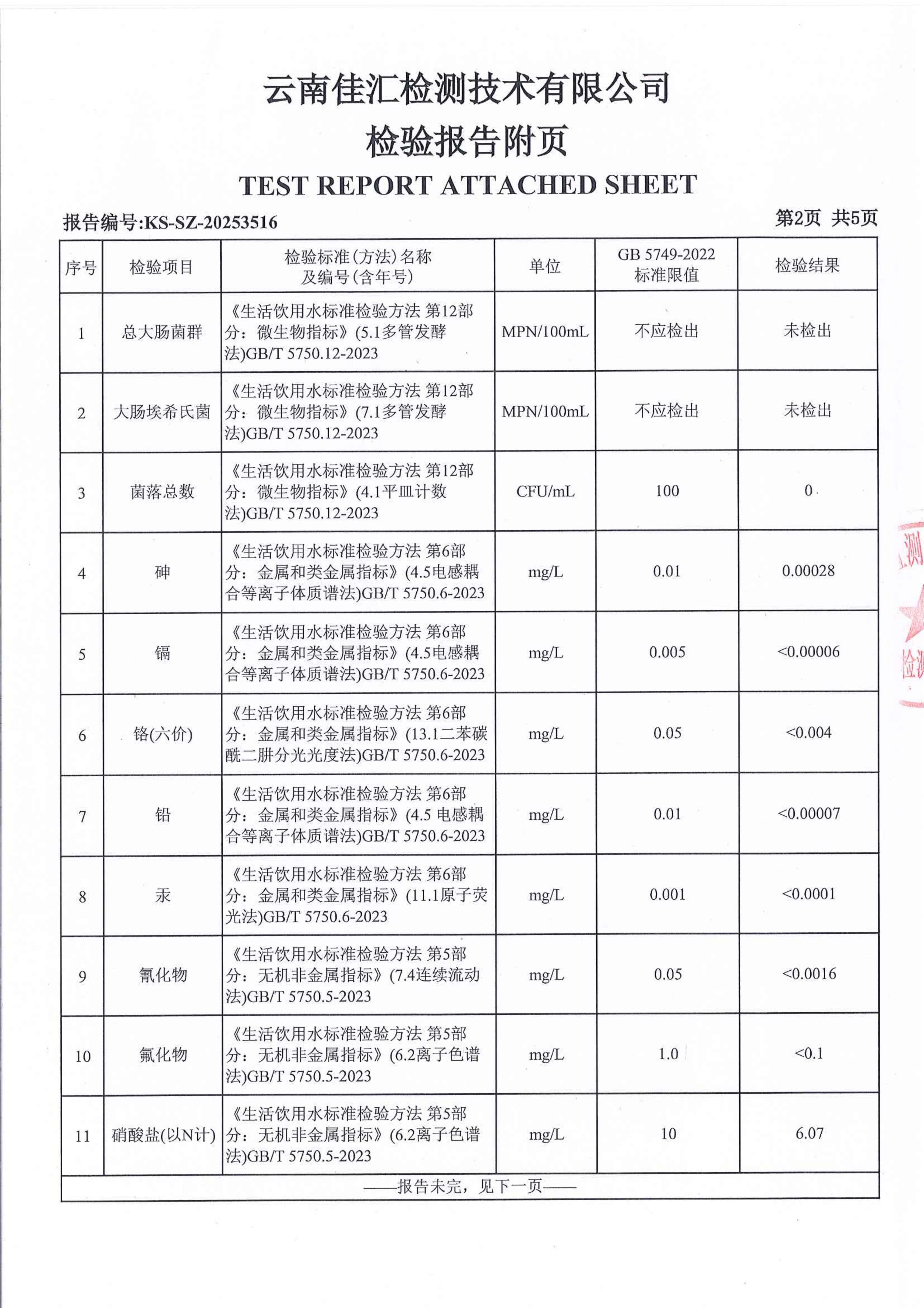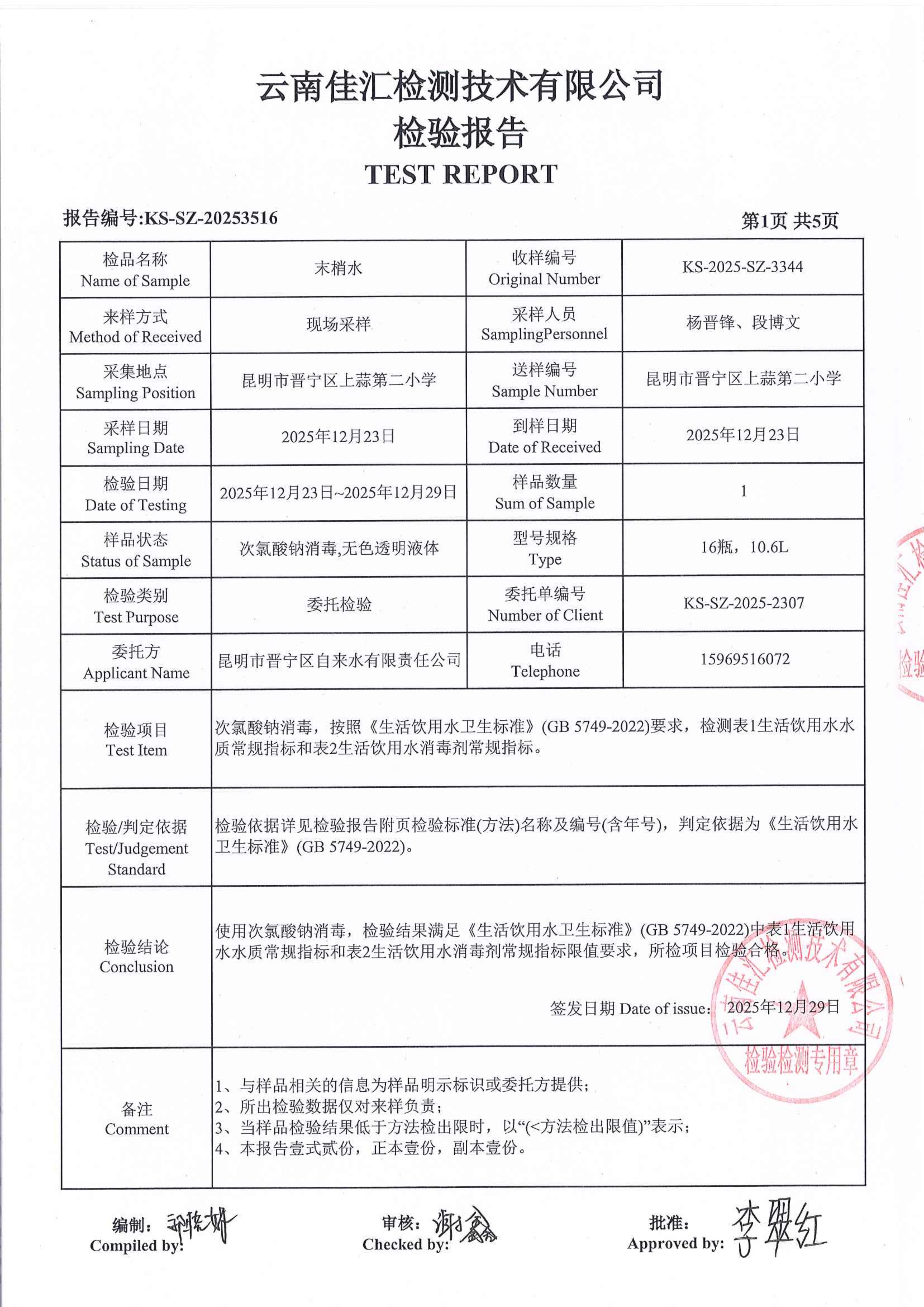 昆明市晋宁区上蒜第二小学水质公示(2025年12月)