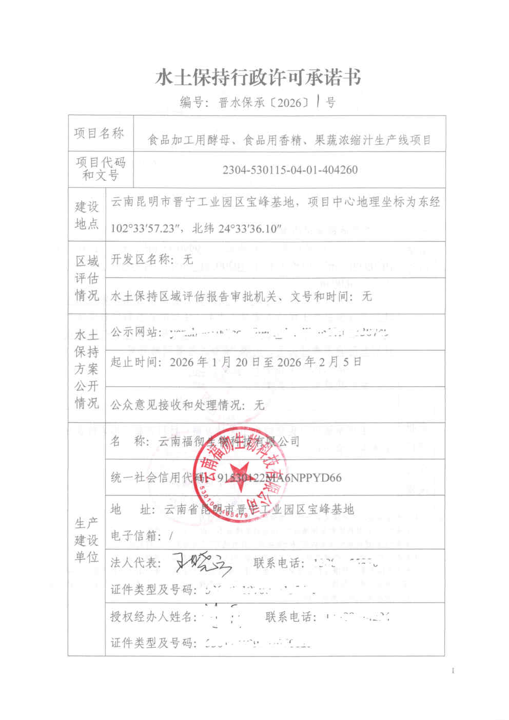 云南福彻生物科技有限公司于2026年2月12日向昆明市晋宁区水务局提出的食品加工用酵母、食品用香精、果蔬浓缩汁生产线项目水土保持方案审批的行政许可申请。经审查,提交的水土保持行政许可承诺书以及水土保持方案报告表,材料完整、格式符合规定要求,符合法定条件、标准,昆明市晋宁区水务局决定准予该项目水土保持方案审批的行政许可。