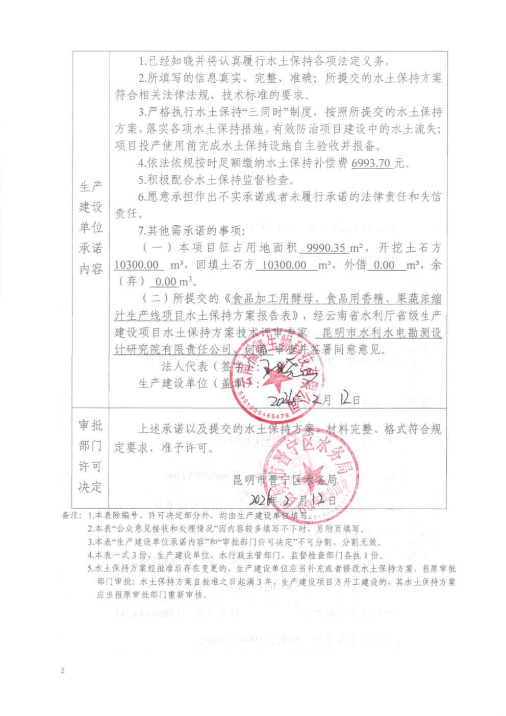 食品加工用酵母、食品用香精、果蔬浓缩汁生产线项目水土保持行政许可承诺书