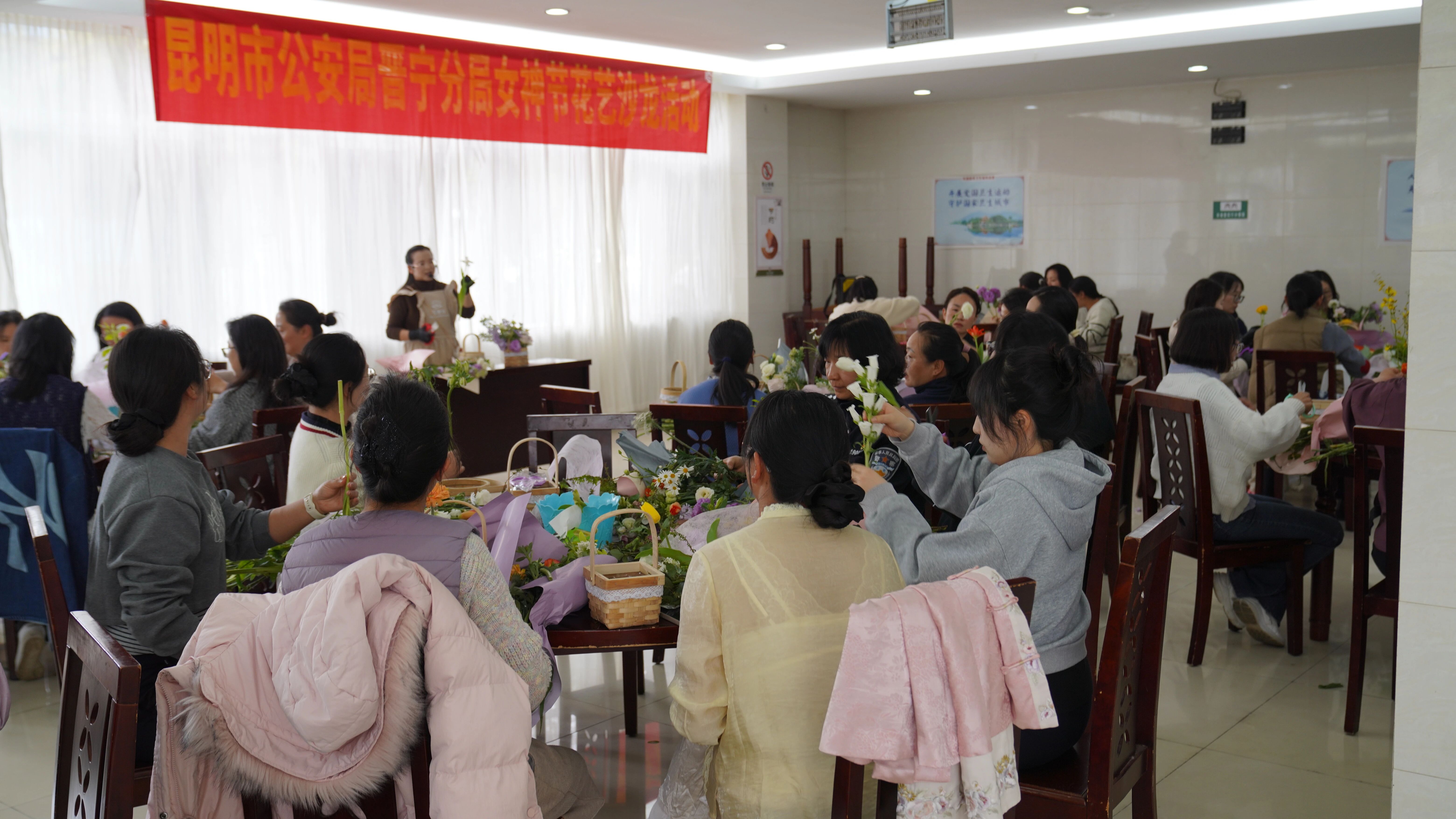 为庆祝“三八” 国际劳动妇女节,丰富警营文化生活,2026年3月6日,昆明市公安局晋宁分局组织开展“花香润警营・巧手绽芳华”花艺沙龙活动,全局女民警、女辅警欢聚一堂,共赴浪漫花艺之约。