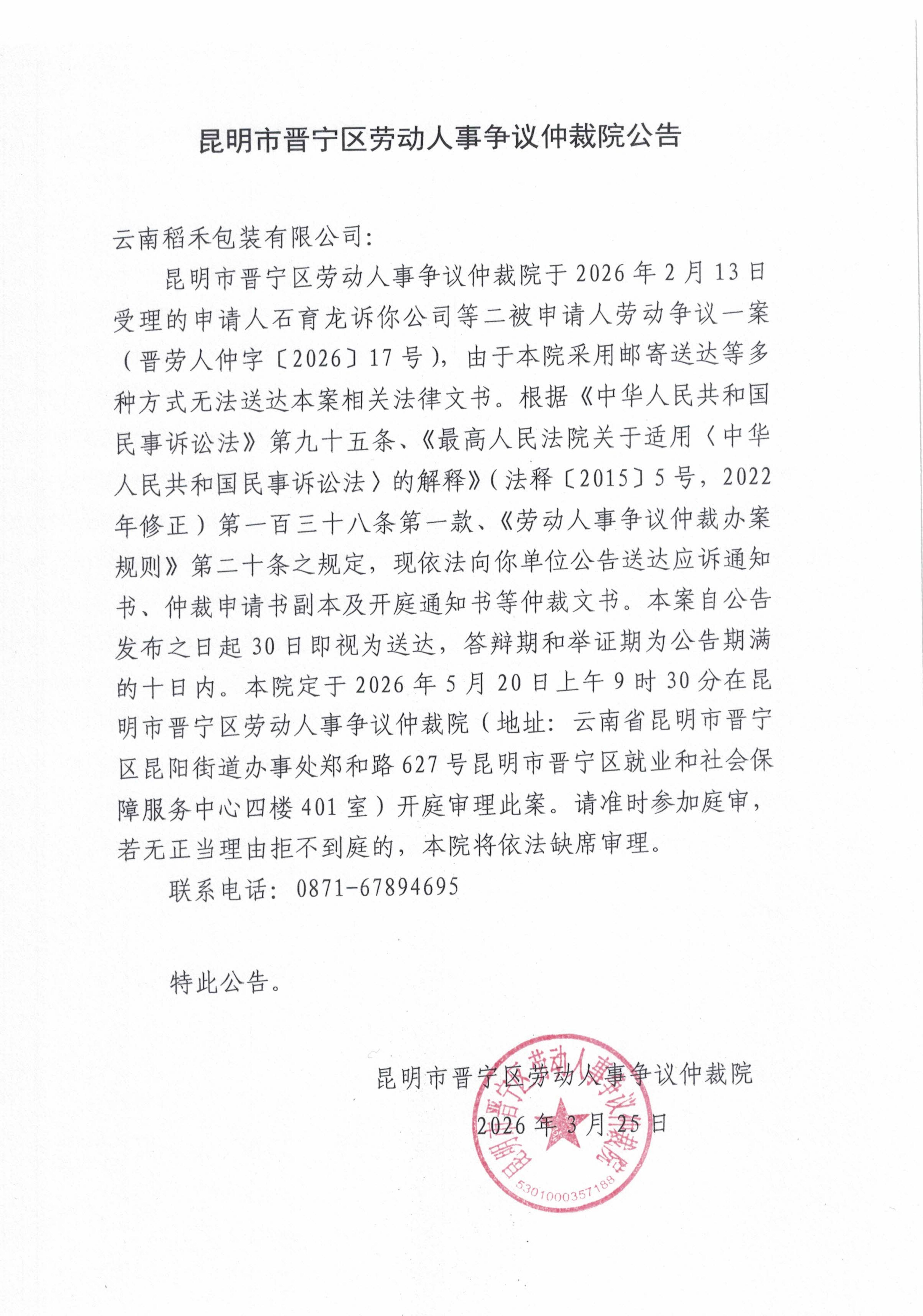 昆明市晋宁区劳动人事争议仲裁院公告(2026年3月25日)——云南稻禾包装有限公司