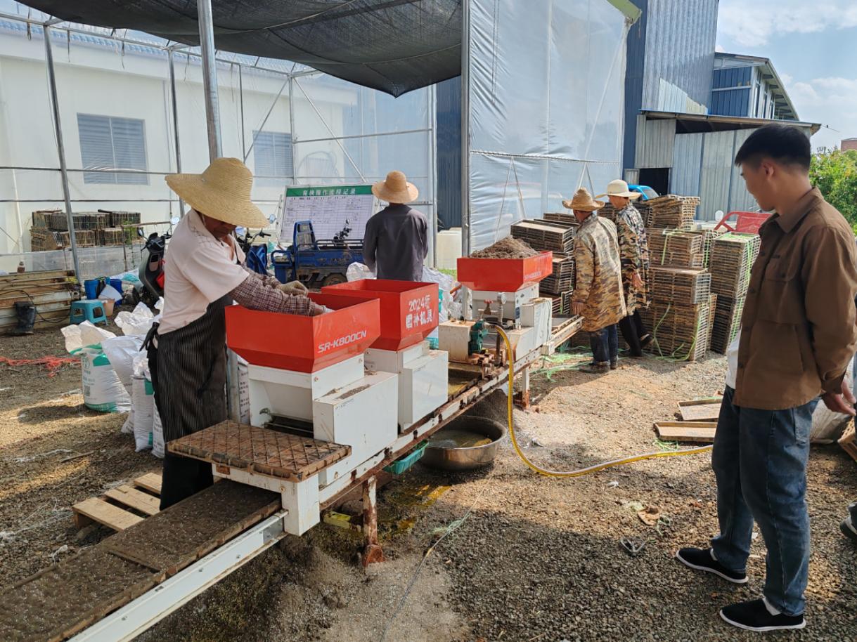 在晋宁康云农机农民专业合作社育秧基地现场,2台“久保田”固定式育秧播种机生产线,正以每小时育秧600盘的速度高效运转,20多名工人穿梭忙碌着,一盘盘育好种子的秧盘自动传输到几十米开外,每台流水线末端4、5名工人将秧盘整齐码放,准备下步“暗化”发芽处理。