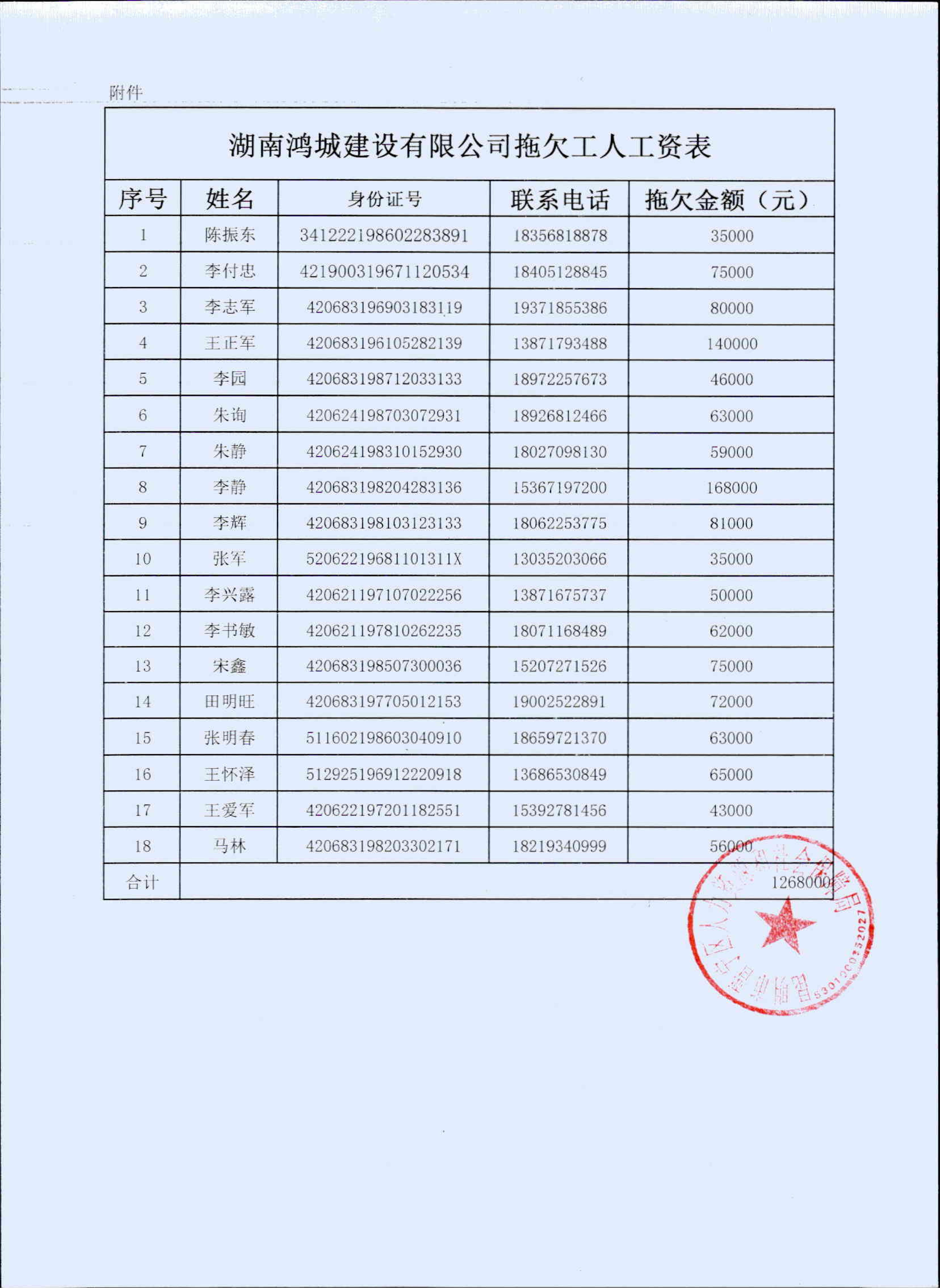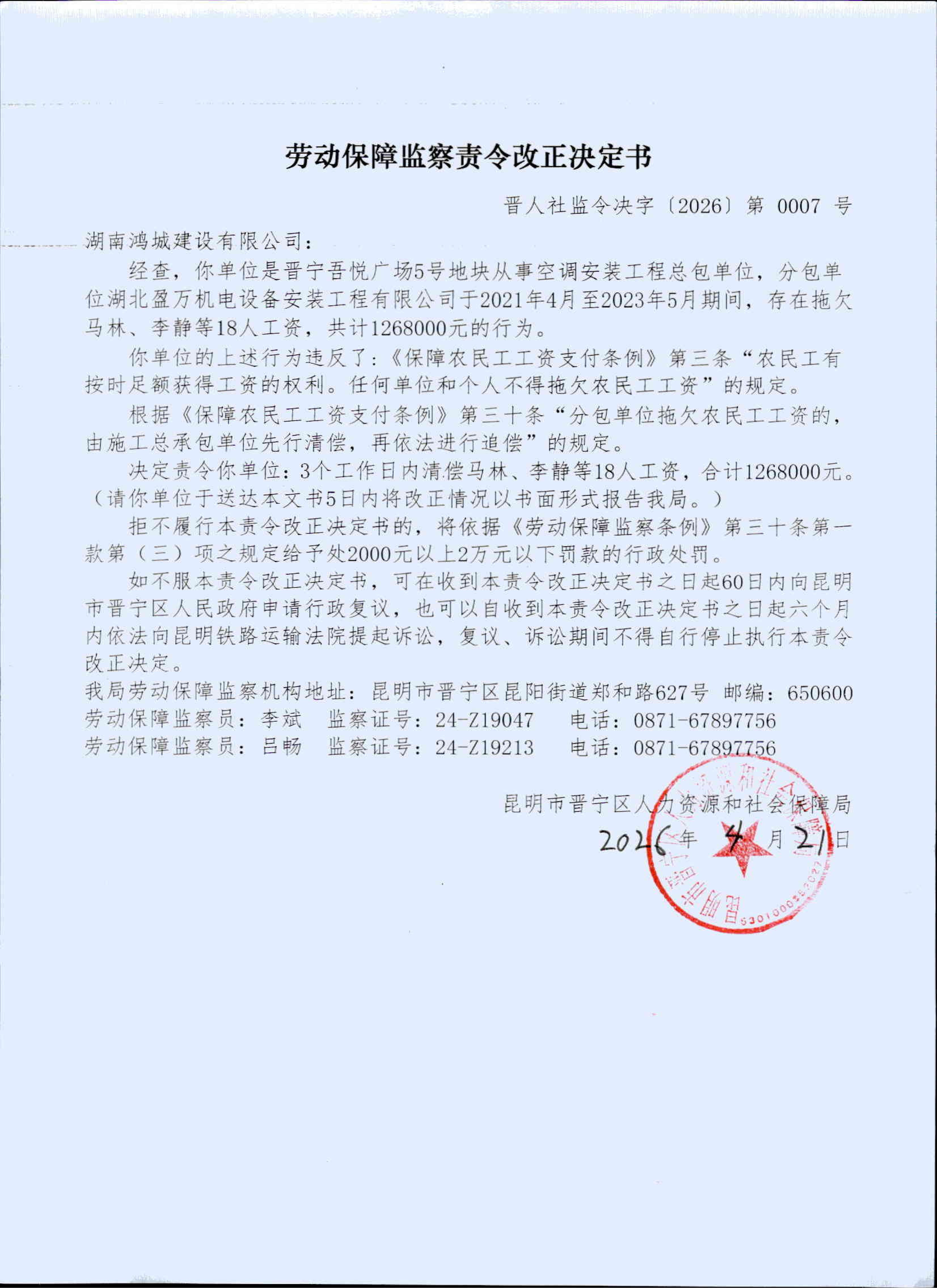 昆明市晋宁区人力资源和社会保障局关于向湖南鸿城建设有限公司送达《劳动保障监察责令改正决定书》的公告